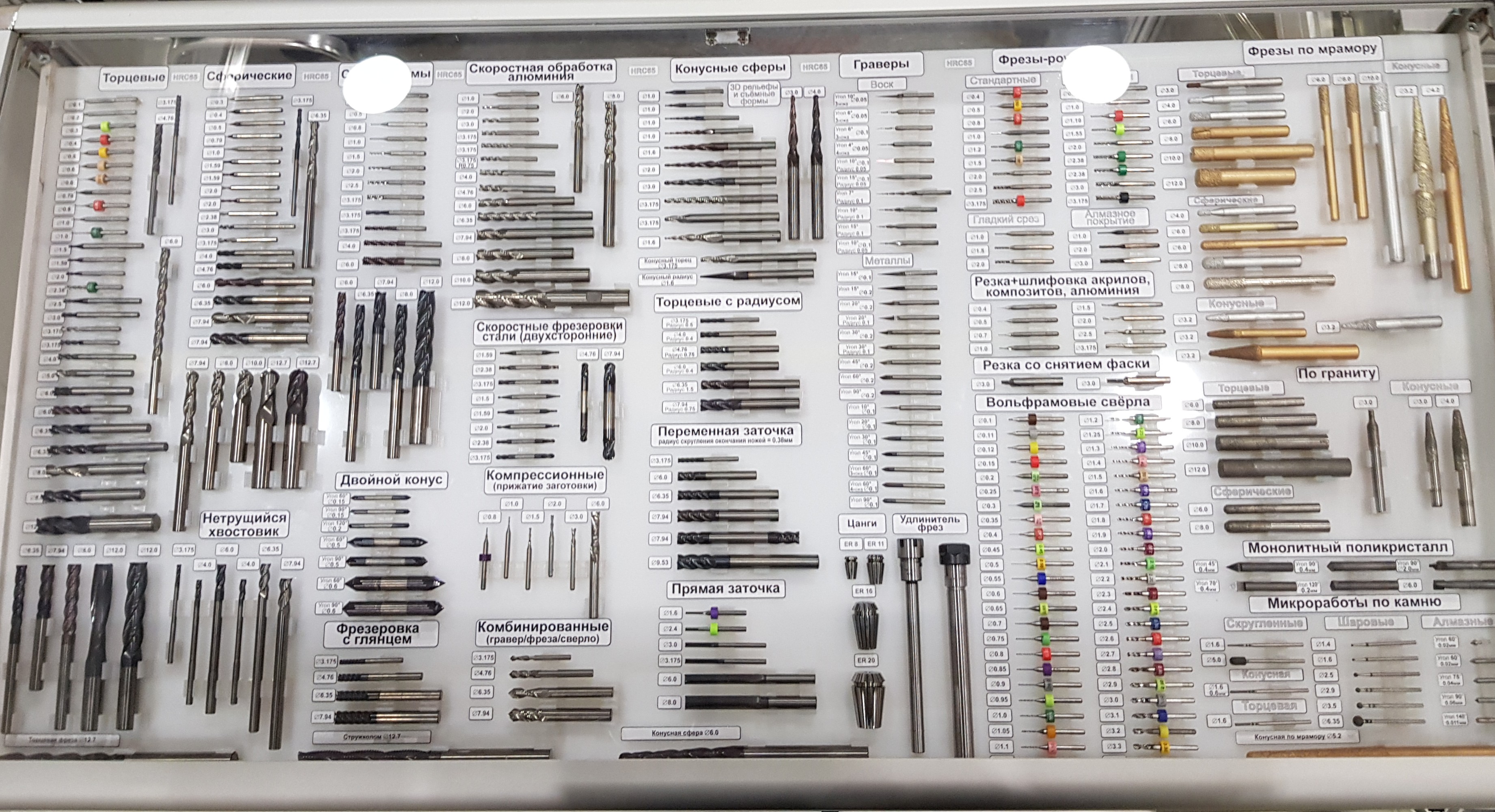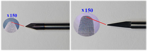 Особенность изделий – высокая стойкость при критических нагрузках при маркировке, фрезеровке металлических изделий с твердостью до HRC 65, а также сплавов и цветных металлов. Для изготовления данных инструментов используются сплавы Sandvik и Konrad. Доступные углы радиусных граверов: 120, 90, 60, 45 градусов c радиусами окончаний: 0,1 мм, 0,15 мм, 0,2 мм и более. Доступные углы пирамидальных фрез: 30, 20, 10 градусов c радиусами окончаний: 0,1 мм, 0,15 мм, 0,2 мм и более.