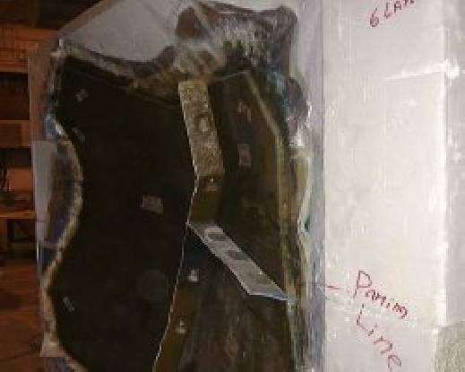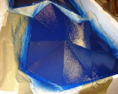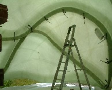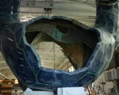 В случае, если пенопласт был крупнопористый, его грунтуют из пульверизатора до заполнения всех пор. Каждый сегмент покрывают гелем. Он нужен для того, чтобы пенопласт легко отпал после формования. Гель также даст гладкость и глянец поверхности. Следующий этап простой, можно сразу покрасить гель, или нанести слой полимерной смолы. На этот слой, как на клей раскатывается синтетическая ткань, стеклоткань и другие материалы, способные хорошо впитывать смолу и облегать поверхности. Эта процедура повторяется до получения необходимой толщины. На последнем этапе, если это крупное изделие, необходимо армировать поверхность для придания повышенной жёсткости. В медведе поверхность армирована жестью, а края жести загнуты. В программах можно сразу задать угол загиба и высоту краёв сегментов. Как все сегменты приготовили, начали сборку как бы этажей, высотой 2-3 метра. Для получения этажей, сегменты сваривали между собой. Этажи медведя ставили один на другой и скрутили болтами. Последней поставили краном голову.