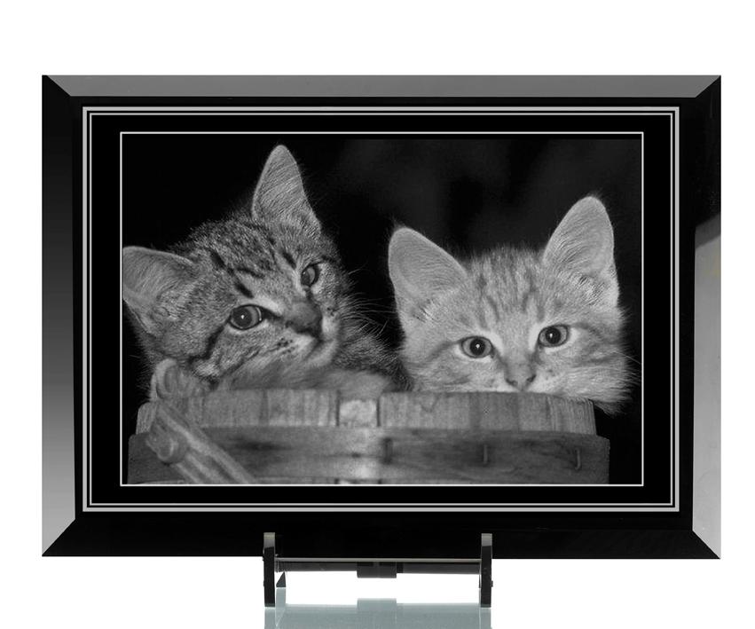 Собака и котята гравированы на чёрном зеркале с применением АМ модуляции на ЧПУ станке: