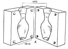 Многие начинающие задаются вопросом: "Как сделать, чтобы изготовленное изделие было внутри полое?". Нет ничего проще этой процедуры. Смотрите на рисунки выше. Сначала форму сильно сжимают, чтобы не было щелей. После этого наливают в форму более жидкий состав, чем если бы Вы делали вазу вручную. Потом нужно немного взболтать, чтобы состав хорошо распределился по стенкам. Затем лишнее надо вылить обратно. Некоторое время, если состав был слишком жидкий, необходимо подержать вниз для хорошего стекания излишков. После этого, нужно поставить форму вертикально. Оставшийся состав стечёт по стенкам на дно, что усилит его дополнительно. После того, как слегка подсохло, налейте состав ещё раз для утолщения стенок сосуда, а как подсохнет - раскройте форму и поставьте вазу в печь. Не только составы из глины могут применяться в таком производстве. Это могут быть любые самотвердеющие смолы и пластмассы.