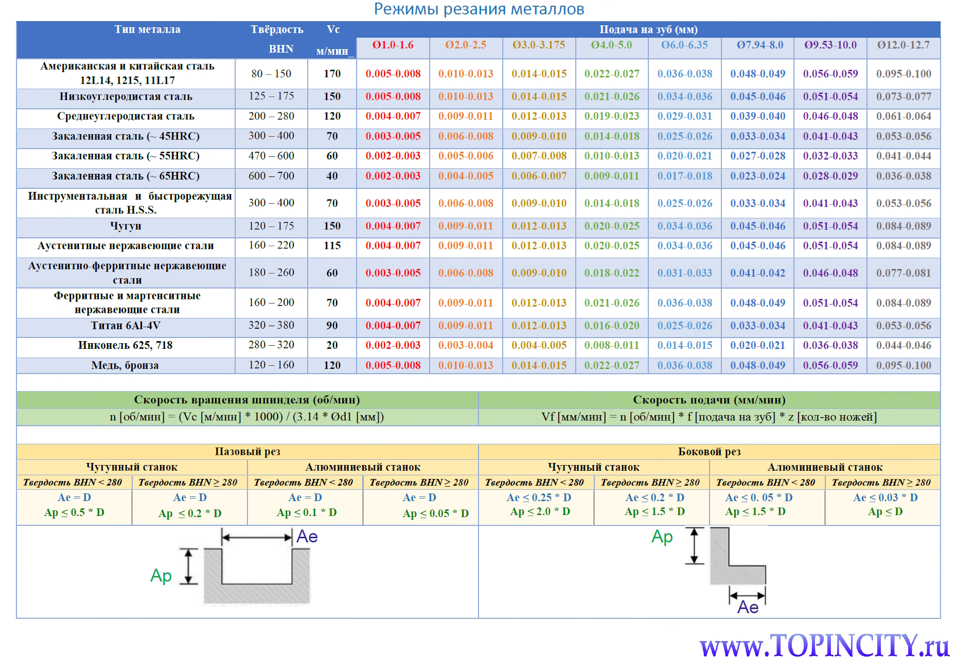Таблица расчёта режимов фрез по металлам предназначена для расчёта оборотов шпинделя и скорости подачи для различных металлов в зависимости от диаметра и количества режущих кромок фрезы