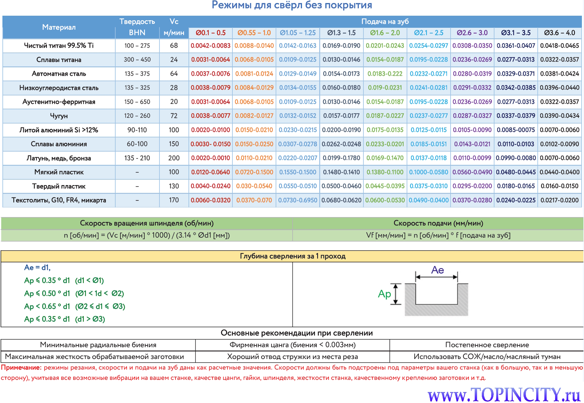 Таблица расчёта режимов свёрл предназначена для расчёта оборотов шпинделя и скорости подачи для различных материалов в зависимости от диаметра сверла