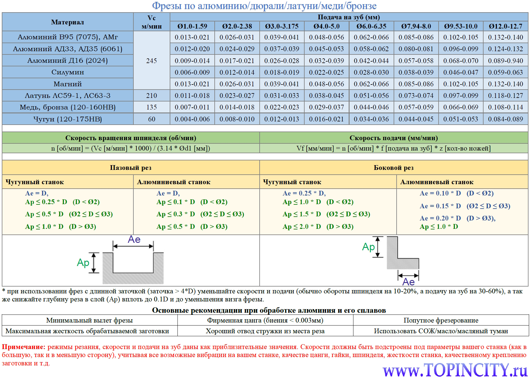Таблица расчёта режимов фрез по цветным металлам предназначена для расчёта оборотов шпинделя и скорости подачи для различных цветных металлов в зависимости от диаметра и количества режущих кромок фрезы